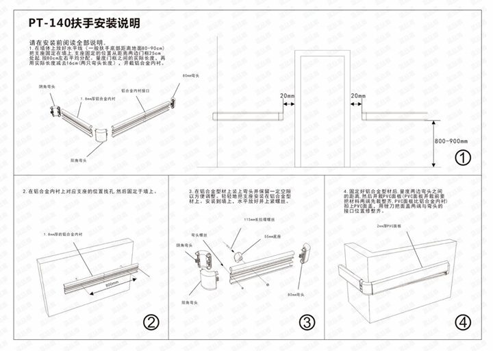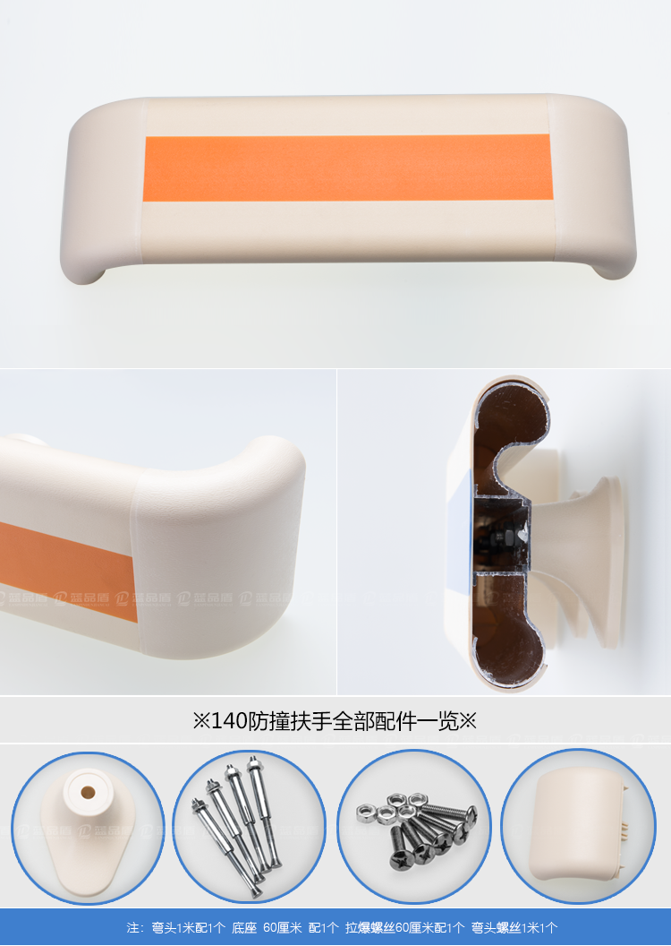 (醫(yī)用PVC扶手,140PVC扶手,140防撞扶手)由四個(gè)部分組成,其中面板采用 PVC(聚氯乙烯材)料生成,材料長(zhǎng)度5米,厚度2.0MM,可定制顏色。底座和封口采用ABS合成樹脂擠壓生成。扶手內(nèi)部采用鋁合金材料,鋁合金長(zhǎng)度5米,有多種厚度可供選擇。